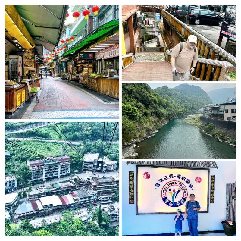We explored Yun Hsien Resort nestled in New Taipei City, finding it somewhat deserted with many places shuttered. Later, we hopped aboard a mini train to reach the stunning Wulai Waterfall and took a cable car ride to enjoy the mountain's scenic vistas. Climbing numerous stairs, we eventually reached the top.